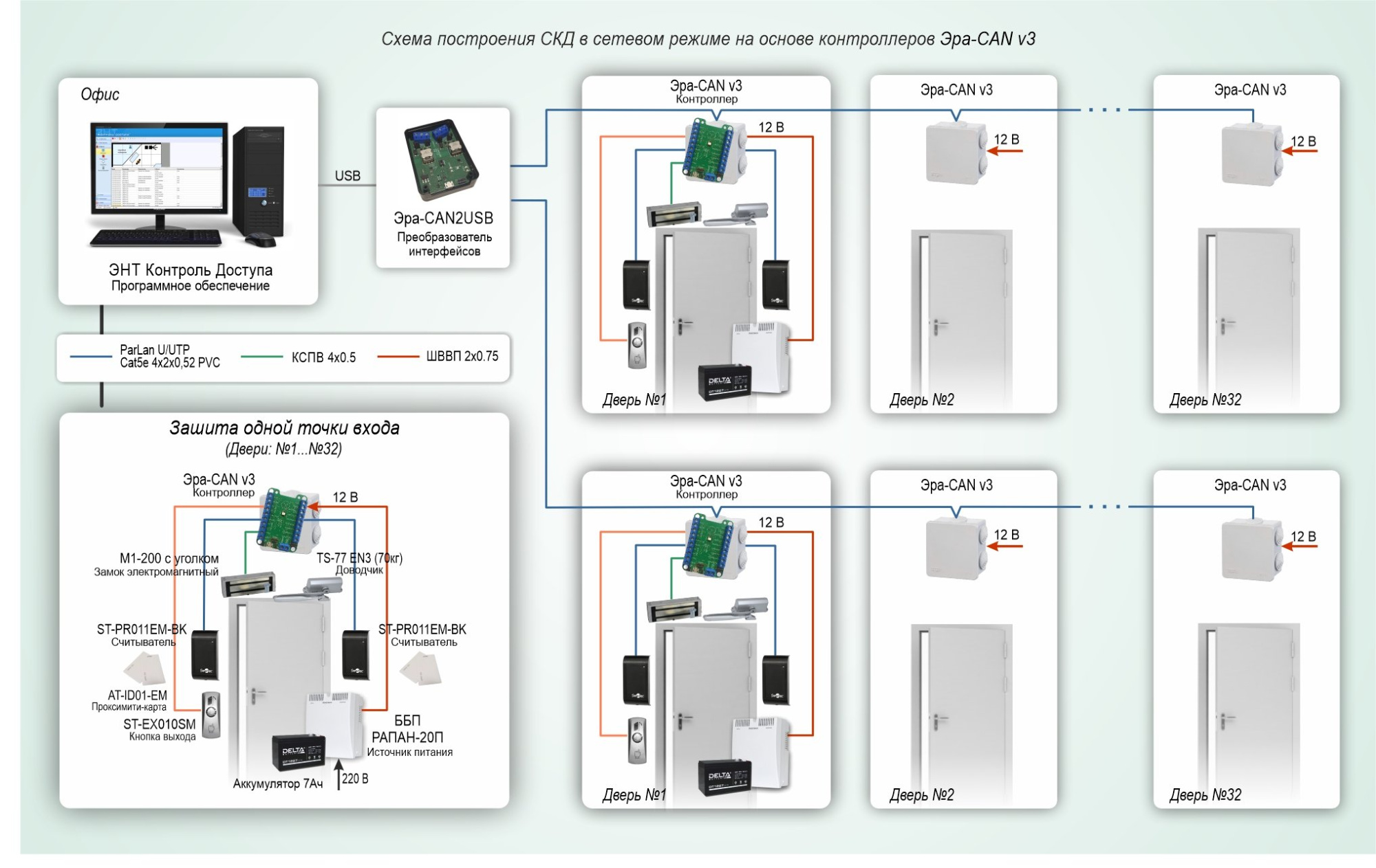 Типовое решение основано на построении системы контроля доступа (СКД) в офисные и жилые помещения. Решение реализовано на оборудовании торговых марок: Эра новых технологий, Smartec, Бастион, Олевс, dormakaba, Паритет.
