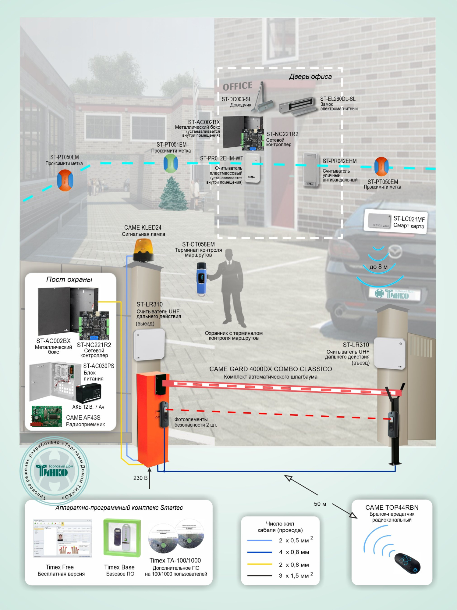 Решение реализовано на базе сетевого контроллера ST-NC221R2 и UHF считывателя ST-LR310 с увеличенной дальностью действия (Smartec) и автоматического шлагбаума CAME GARD 4000DX COMBO CLASSICO.