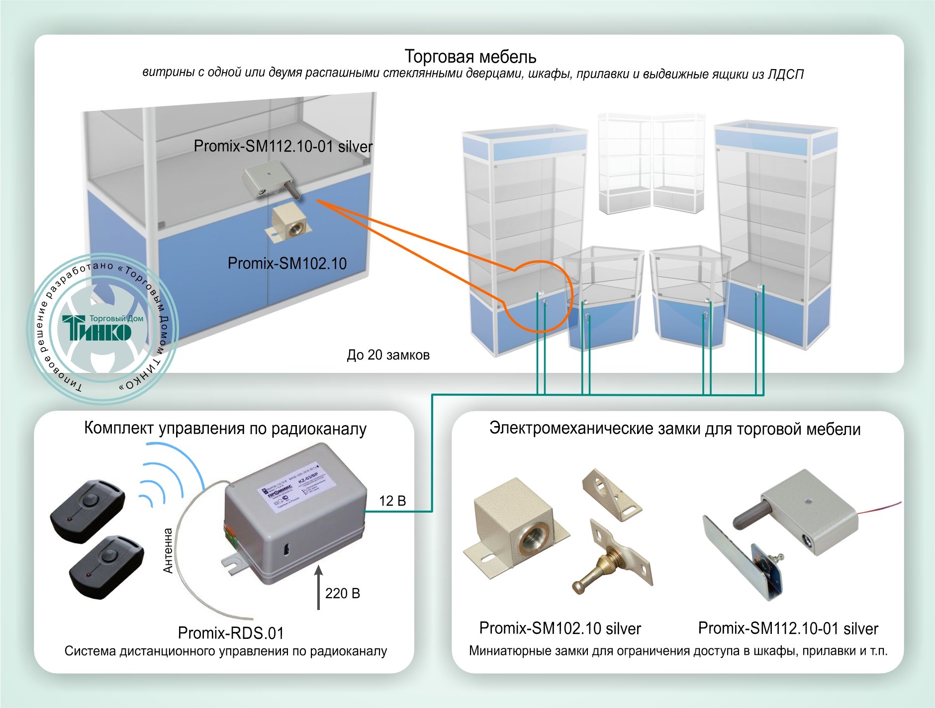Схема построения СКУД на базе комплекта "Promix-RDS.01" и замков для торгового оборудования "Promix-SM112.10" и "Promix-SM102.10 silver"