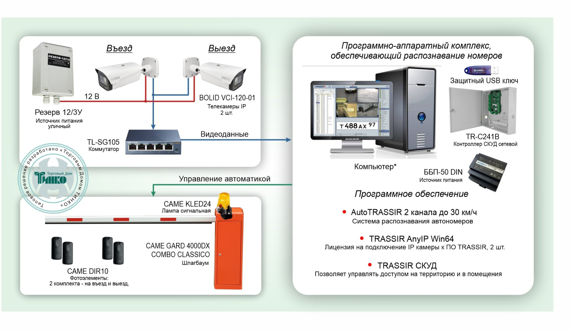 Типовое решение основано на построении системы контроля доступа (далее система) с автоматическим распознаванием государственных регистрационных знаков автомобилей для организации дифференцированного въезда на охраняемую территорию.
