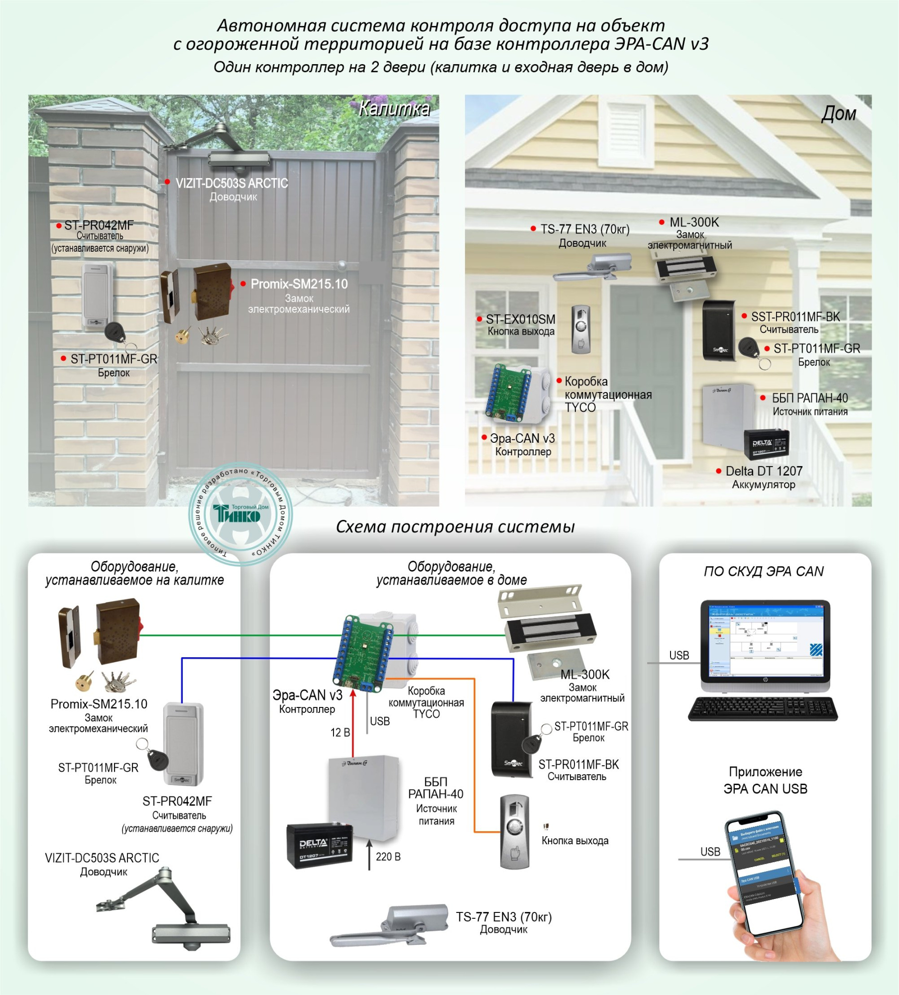 Типовое решение основано на построении автономной системы контроля доступа (далее система) в дом и на огороженную территорию, прилегающую к дому. Решение реализовано на оборудовании торговых марок: Эра новых технологий, Бастион, Smartec, Промикс, AccordTec, dormakaba.