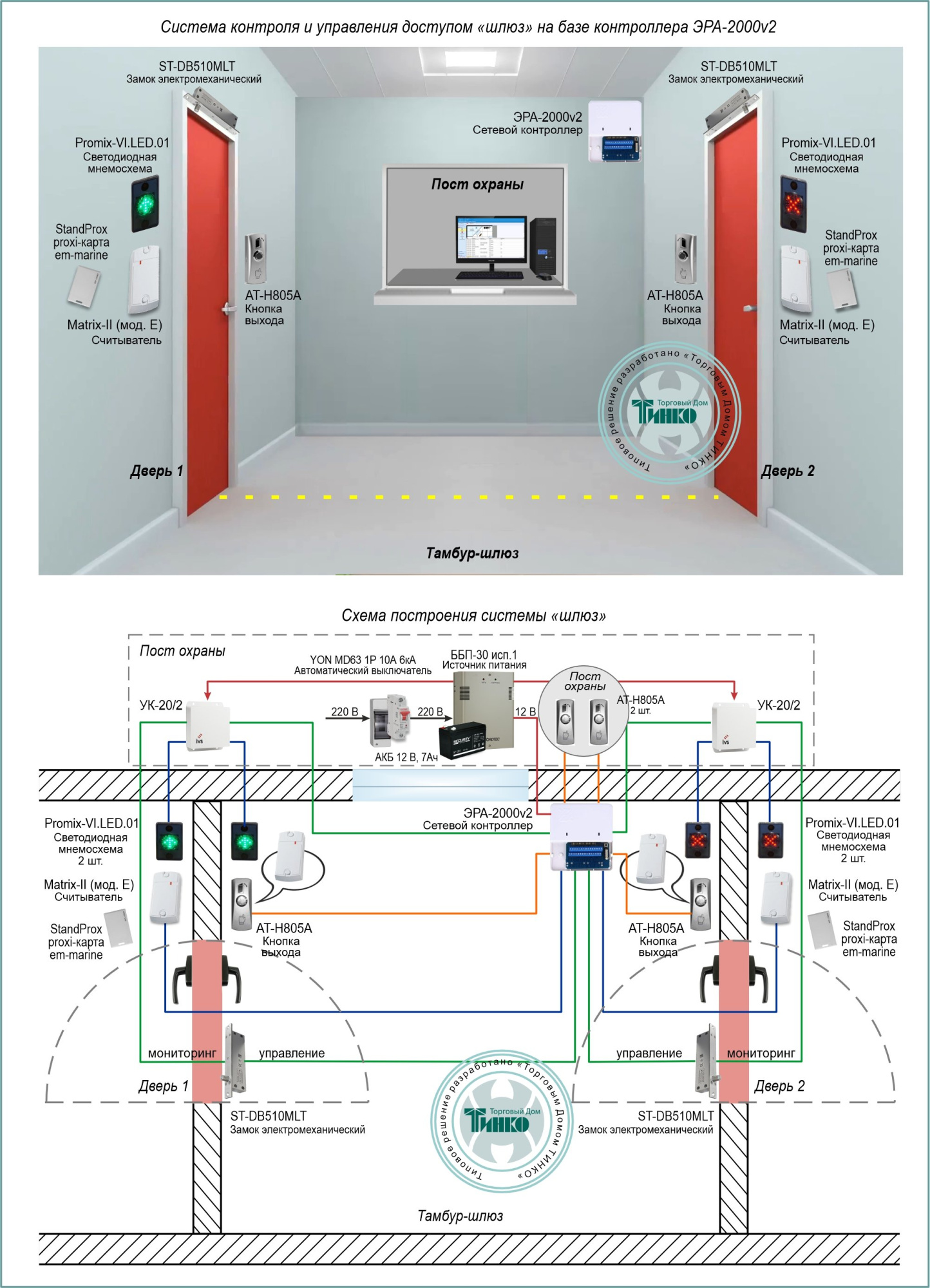 Схема построения системы контроля и управления доступом «шлюз» на базе контроллера ЭРА-2000v2