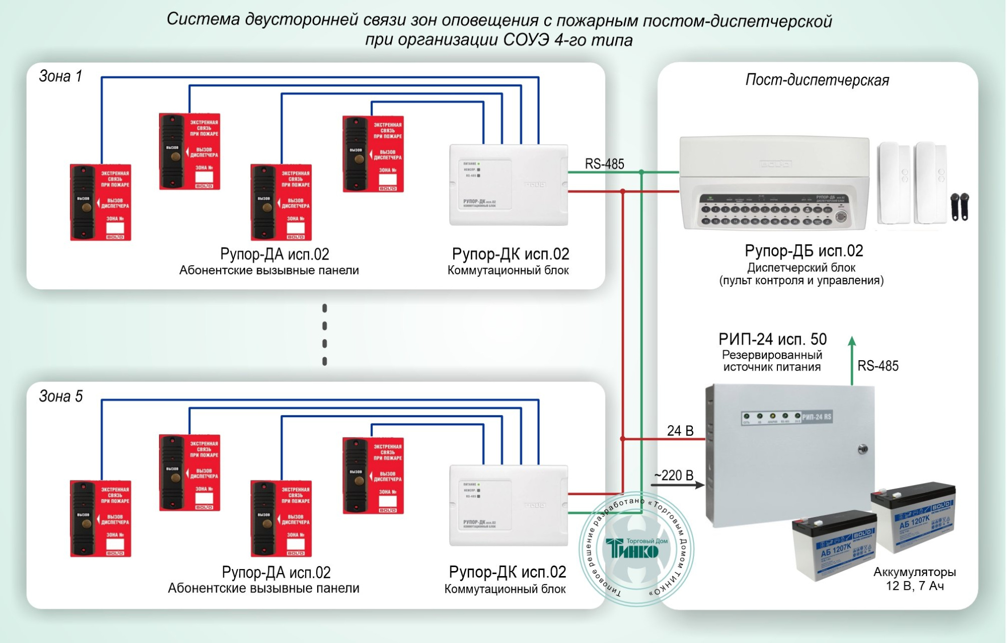 Типовое решение представляет собой систему двусторонней связи пожарного поста (диспетчерской) с зонами оповещения людей о пожаре при организации СОУЭ 4-го типа согласно СП 3.13130.2009. Система является одним из способов оповещения людей о пожаре и управления безопасной эвакуацией в зданиях и сооружениях.