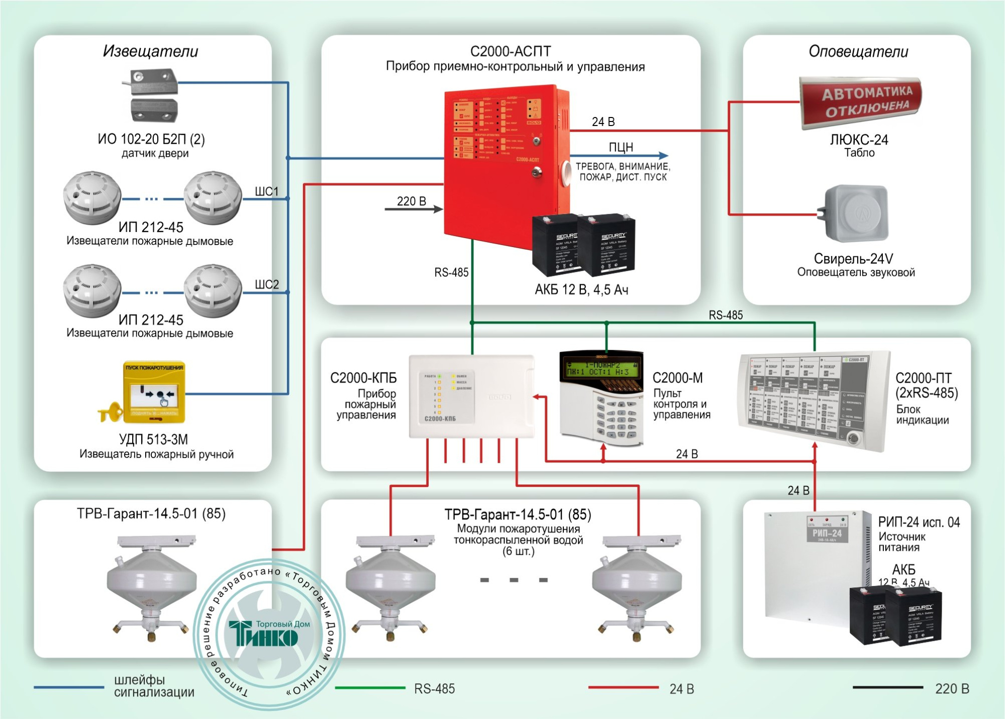 Типовое решение для создания системы противопожарной защиты помещений построено на базе оборудования производства НВП "Болид" и ГК «ЭТЕРНИС». Основное оборудование системы: прибор приемно-контрольный и управления С2000-АСПТ, пульт контроля и управления С2000-М, блок индикации С2000-ПТ (2xRS-485) (два интерфейса RS-485), а также модули пожаротушения тонкораспыленной водой «ТРВ-Гарант-14,5-01 (85)». Для расширения системы могут использоваться блоки С2000-КПБ (до 97), позволяющие увеличить количество пусковых цепей или зон пожаротушения. Сработка модулей происходит при срабатывании пожарных дымовых извещателей ИП 212-45 или пожарного ручного извещателя УДП 513-3М, включенных в пожарные шлейфы прибора С2000-АСПТ.