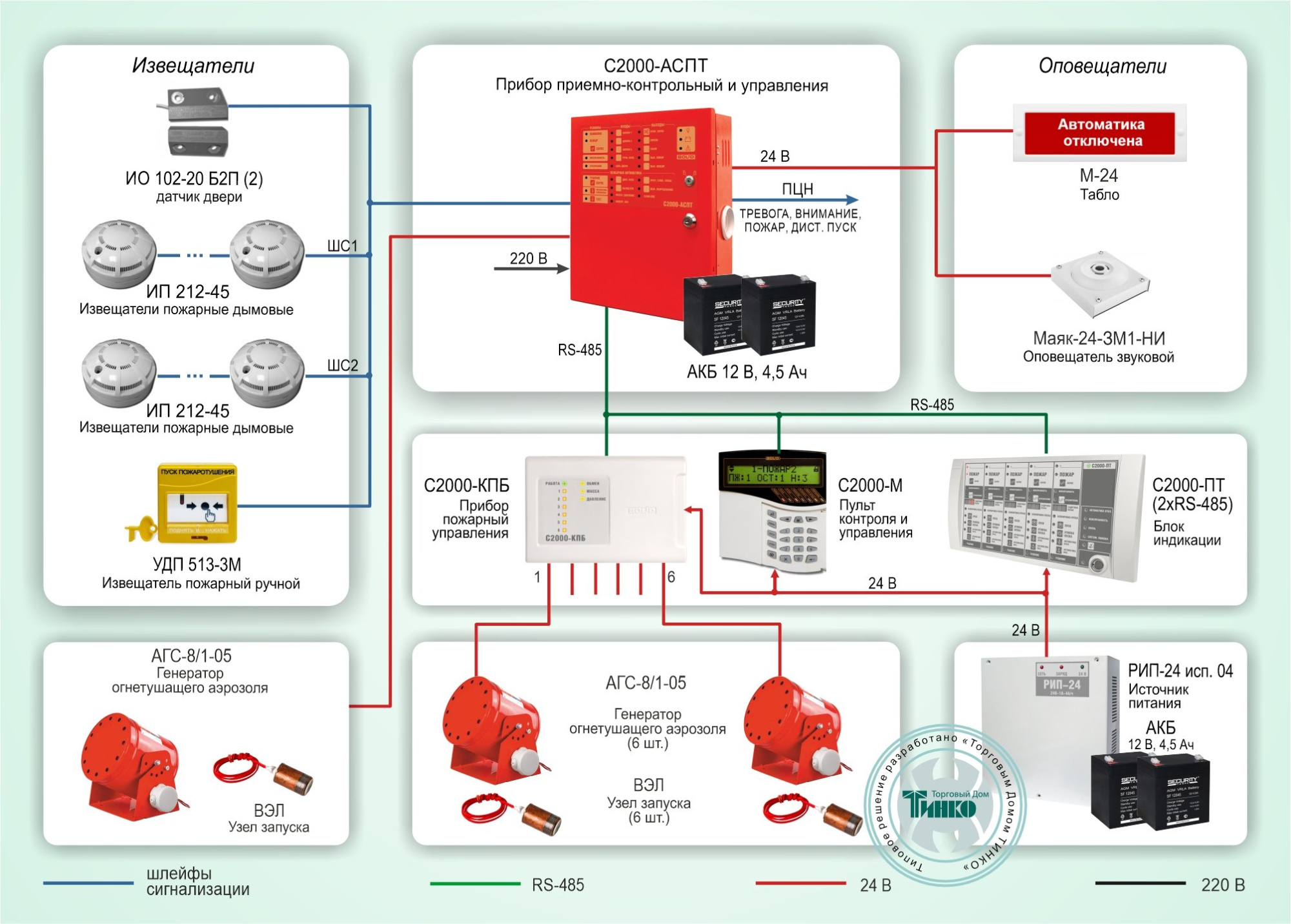 Основное оборудование системы: прибор приемно-контрольный и управления С2000-АСПТ, пульт контроля и управления С2000-М, блок индикации С2000-ПТ (2xRS-485) (два интерфейса RS-485), а также генераторы огнетушащего аэрозоля АГС-8/1-05 с узлами запуска ВЭЛ (поставляются в комплекте).