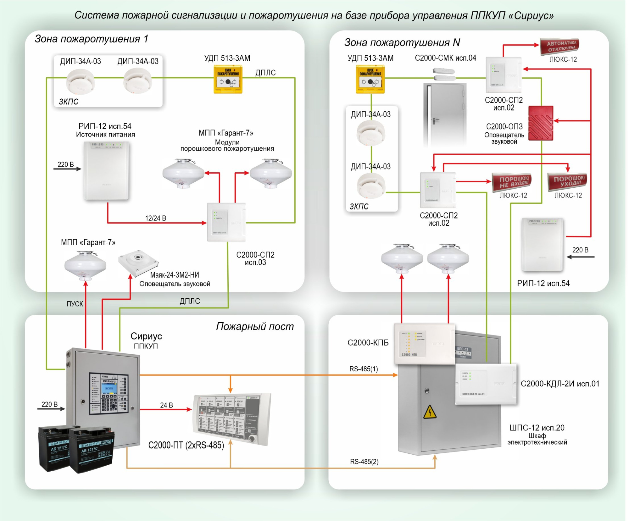 Система пожарной сигнализации и пожаротушения на базе прибора приемно-контрольного и управления “Сириус” (НПО Болид) представляет собой комплексное решение для обеспечения безопасности объектов. Она состоит из основного прибора “Сириус”, блока индикации и управления “С2000-ПТ”, пожарных извещателей “ДИП-34А” для обнаружения возгорания и модулей порошкового пожаротушения «Гарант-7» (ЭТЕРНИС) для быстрой ликвидации пожара.