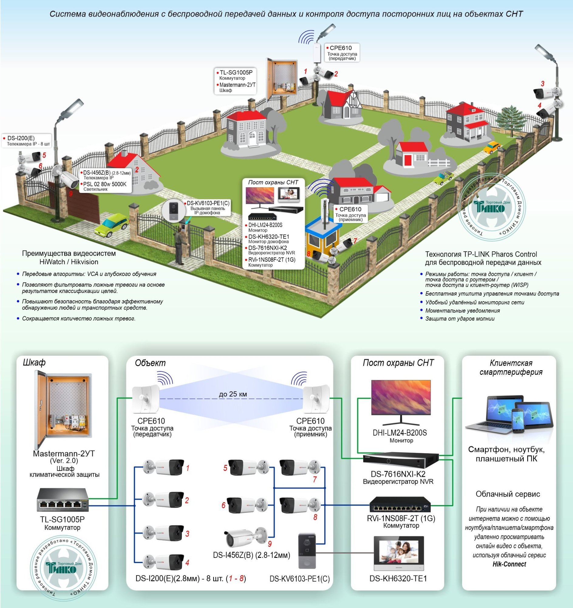 Типовое решение организации системы видеоконтроля за периметром садового некомерческого товарищества (СНТ) и контроля доступа посторонних лиц реализовано на оборудовании HiWatch, Hikvision, TP-Link, Телеком-Мастер