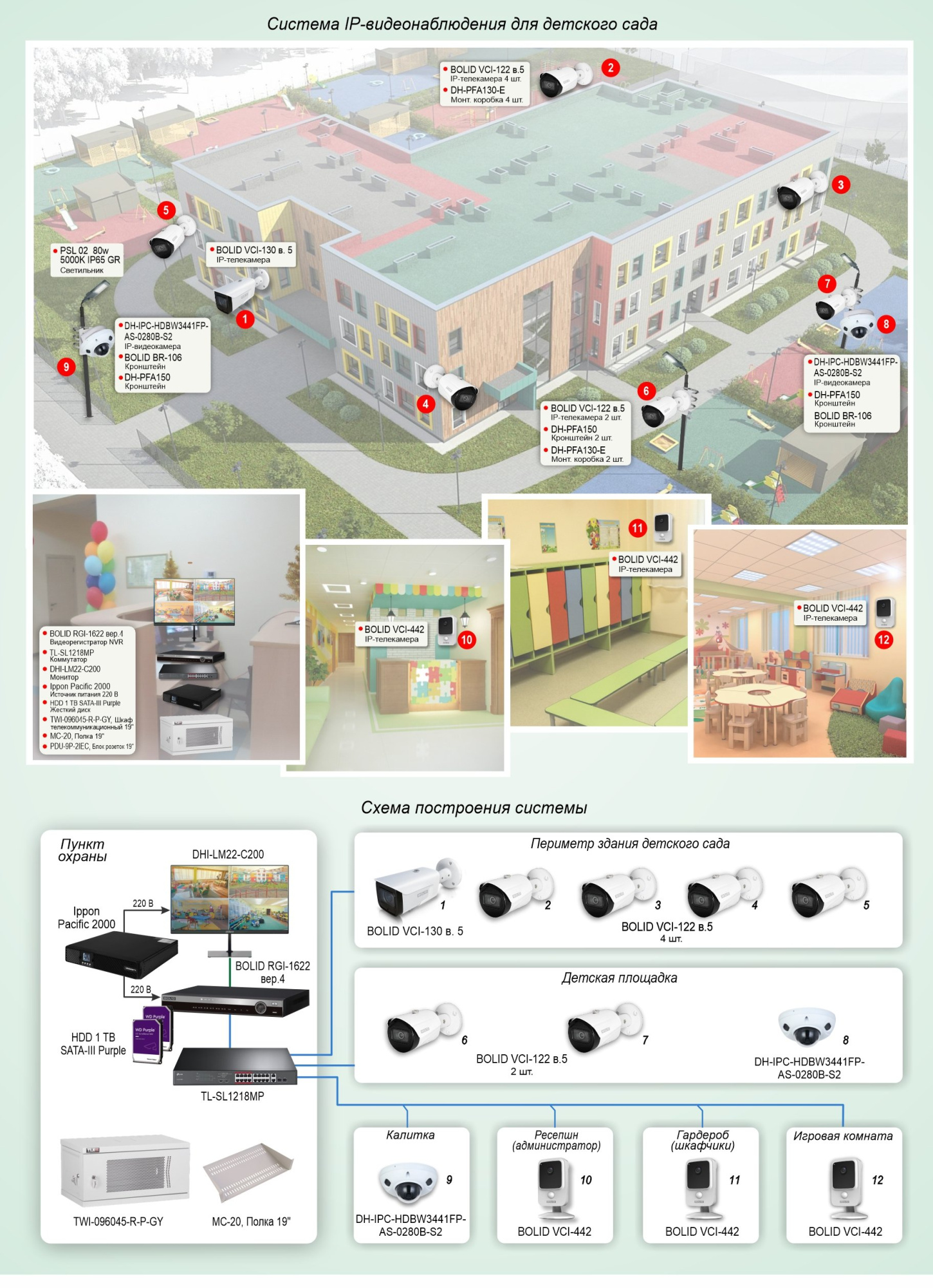 Типовое решение защиты объекта, детского сада с прилегающей огороженной территорией, основано на построении IP системы видеонаблюдения на оборудовании Болид.