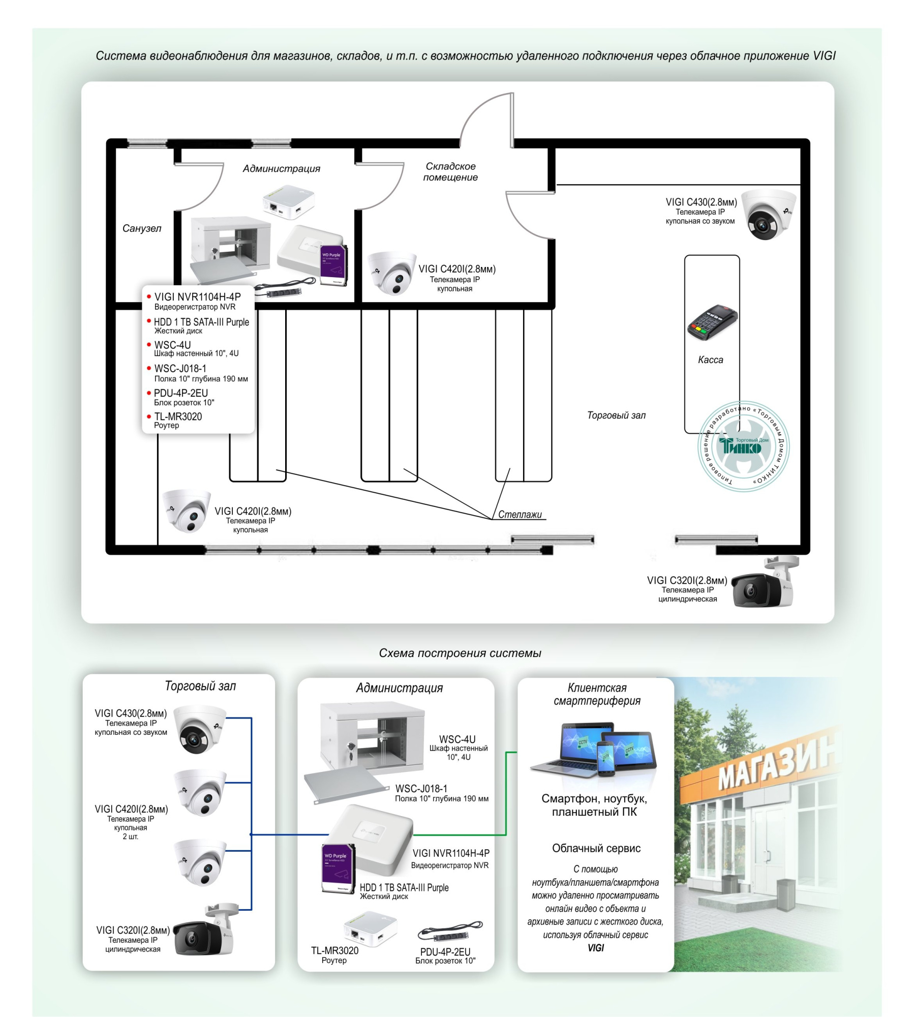 Типовое решение организации системы видеоконтроля для магазинов, складов и т.п. реализовано на оборудовании TP-Link, CABEUS, SkyNet и предназначено для: