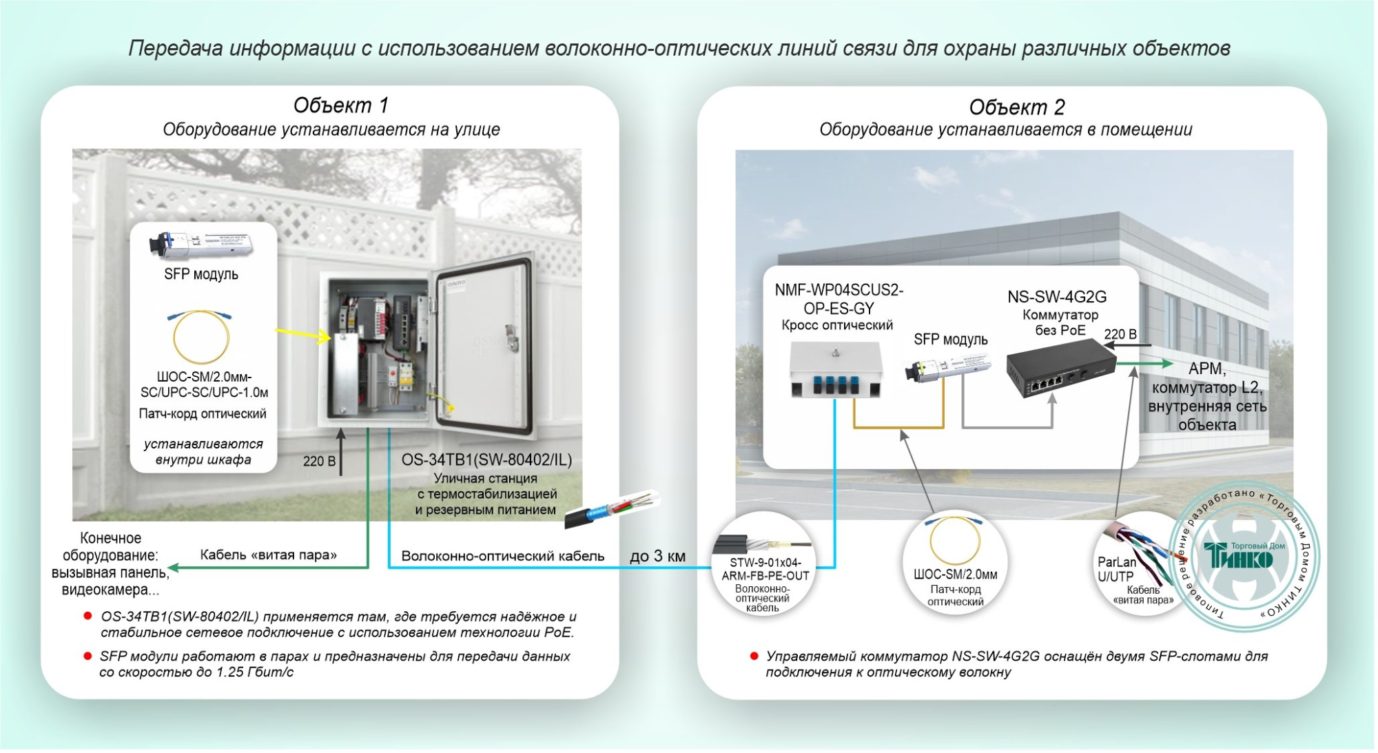 Типовое решение основано на построении системы передачи информации с использованием волоконно-оптических линий связи для охраны различных объектов. Система реализована на базе оборудования торговой марки "OSNOVO" и оптоволоконного кабеля производства Еврокабель-1.