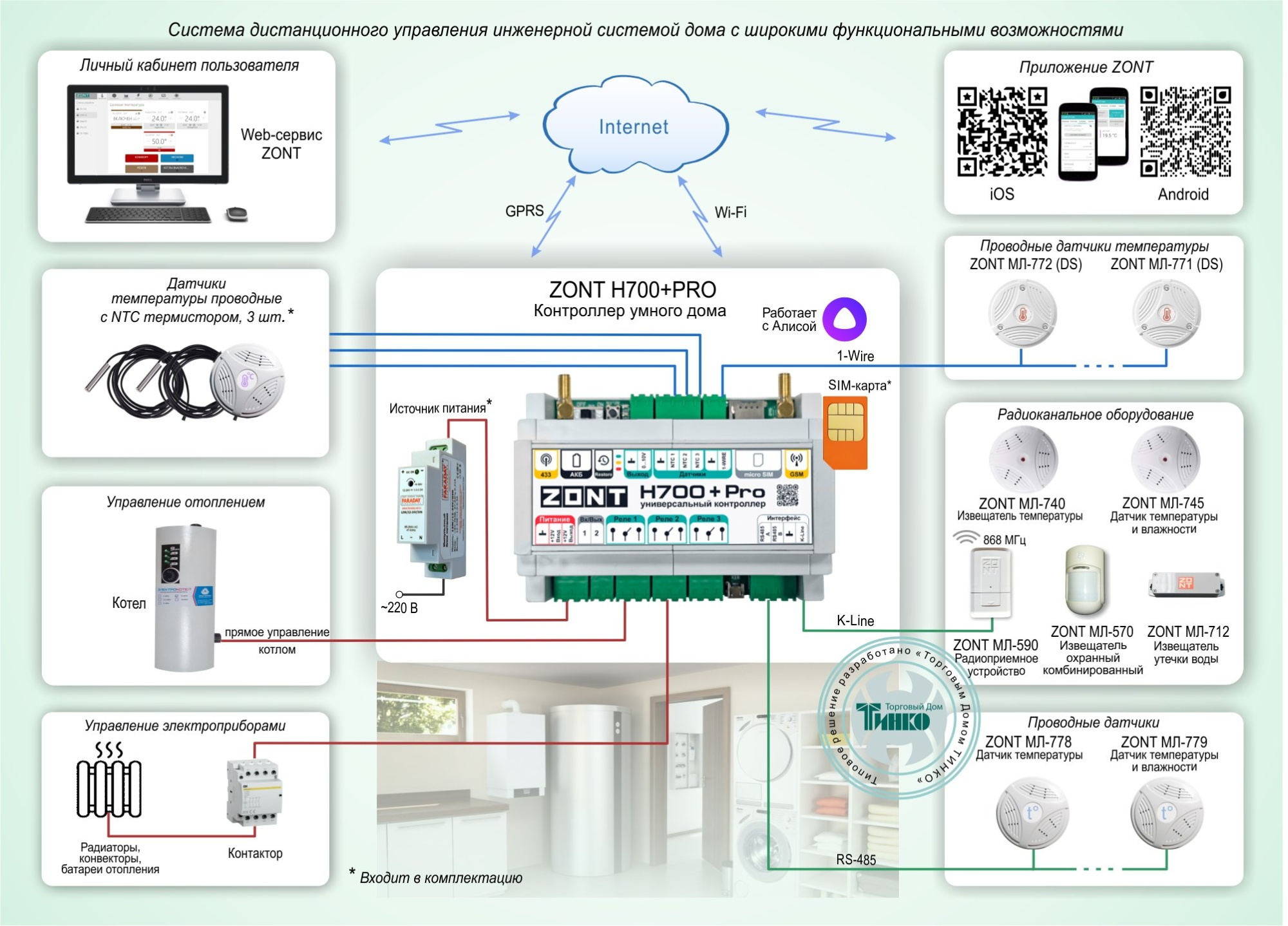 Универсальный контроллер ZONT H700+PRO, который является основой решения, обеспечивает: