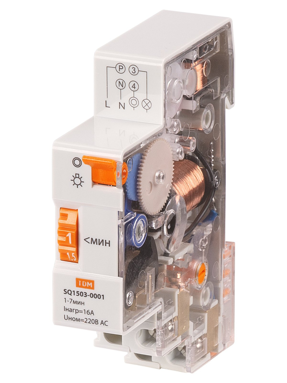Таймер лестничный. Таймер лестничный (включения освещения), монтаж на DIN-рейку, ширина 1 модуль; U-ном. 220 В, I-ном. 16 А, время включения 1…7 мин., шаг регулировки 0.5 мин., УХЛ4, IP20, t-раб.-25...+50°C, габ.размеры ВхГхШ 86х68х18 мм