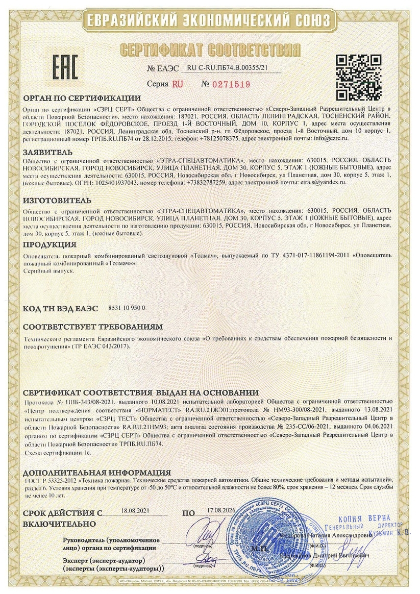 Оповещатель пожарный комбинированный «Толмач» предназначен для оповещения людей о пожаре посредством предварительно записанного речевого сообщения и светового стробоскопического излучателя, относится к оповещателям активного типа.Общепромышленное исполнение оповещателя «Толмач» имеет степень защиты оболочки IР68 по ГОСТ 14254. Оповещатель «Толмач»-П питается номинальным напряжением 12В постоянного тока, оповещатель «Толмач»-П220 - от сети 220В 50Гц.Конструкция оповещателя допускает его эксплуатацию в условиях воздействия агрессивных сред.Класс изделия по степени защиты человека от поражения электрическим током – III по ГОСТ 12.2.007.0.