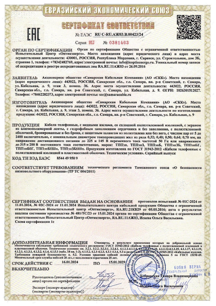 Конструкция: Жила - мягкая медная проволока;Изоляция - изоляционный полиэтилен высокого давления (ПВД);Заполнитель - гидрофобинол;Поясная изоляция - ПЭТФ пленка и/или мешочная бумага;Экран - алюмополиэтиленовая лента с проложенной под ней медной луженой проволокой;Оболочка - светостабилизированный полиэтилен высокого давления;Условия эксплуатации и монтажа:рабочая температура - от -50 до +50 С;растягивающая нагрузка кабелей при прокладке, не более - 50 Н/мм2 общего сечения токопроводящих жил;минимальный срок службы в нормальных условиях эксплуатации - 25 лет;преимущественные области применения - прокладка в условиях повышенной влажности в коллекторах, шахтах, телефонной канализации и по стенам зданий, или подвеской на воздушных линиях связи;температура прокладки - не ниже -10 С;