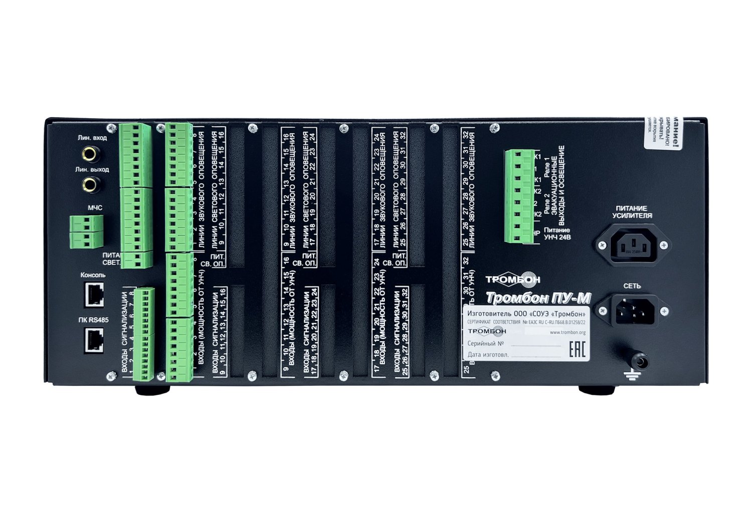 Прибор управления средствами оповещения и эвакуацией на 8 зон. Многозонный прибор управления техническими средствами оповещения и эвакуацией для СОУЭ 3, 4 и 5 типов; зон светового и звукового оповещения - 8; напряжение питания 220 В 50 Гц; встроенный блок резервного питания 12 В; встроенный звуковой процессор на 8 речевых сообщений по 15 сек.; порт для подключения до 8 удаленных консолей Тромбон-УК; сопряжение с ПК (RS 485); сопряжения с системами безопасности Орион, Интеллект+ и GOAL; контроль линий связи; вход ГО и ЧС; 483х384х176 мм (4U); 14 кг