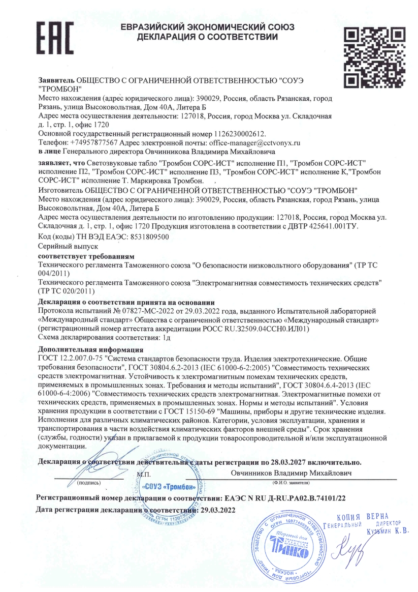 Информационное светозвуковое табло. Информационное светозвуковое табло «Тромбон СОРС-ИСТ» исполнение К устанавливается на входе в помещения и зоны безопасности, специально оборудованные для маломобильных групп населения (МГН). Максимальная длина линий связи - 20м, пластиковый корпус, IP40, 0...+40°C, 150х150х25 мм, 0.3 кг.