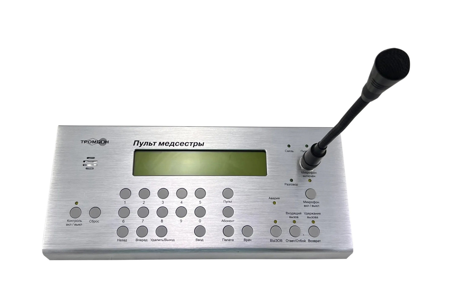 Пульт, в составе с другими компонентами комплекса «Тромбон СОРС-Мед», предназначен для построения системы речевой палатной сигнализации «Тромбон СОРС-Мед»; а также для фиксации вызовов от пациента(-ов), для приёма и передачи голосовых сообщений между медицинским персоналом (медсестрой) и врачом или пациентом.