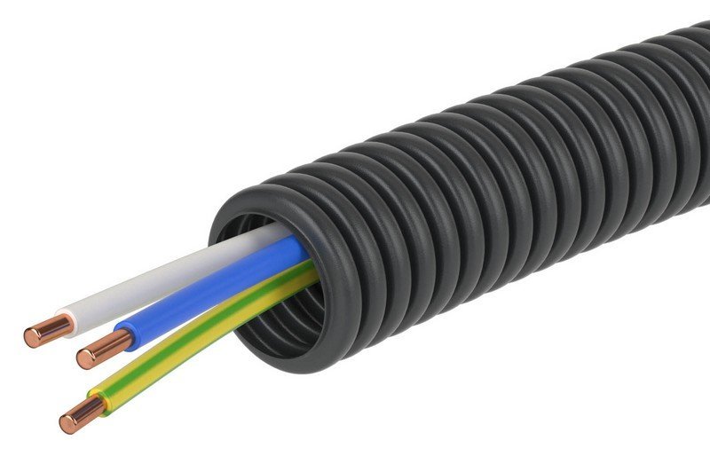 Труба гофрированная с кабелем. Труба гофрированная (ПНД) + провод ПуВ 3х2,5 мм² РЭК (ГОСТ+); Ø-номин. 16 мм, IP55, t-раб.-40…+90°С, цвет черный. Бухта 50 м.