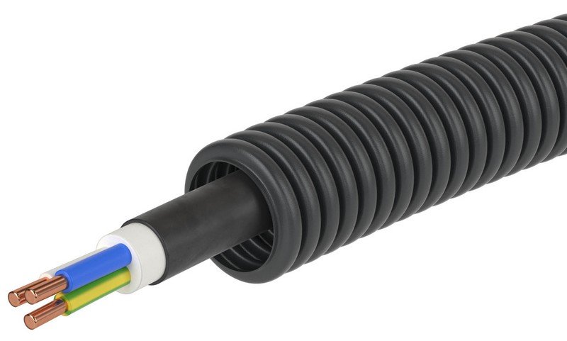 Труба гофрированная с кабелем. Труба гофрированная (ПНД) + кабель ВВГнг(А)-LS 3х2,5 мм² РЭК (ГОСТ+); Ø-номин. 20 мм, IP55, t-раб.-40…+90°С, цвет черный. Бухта 100 м.