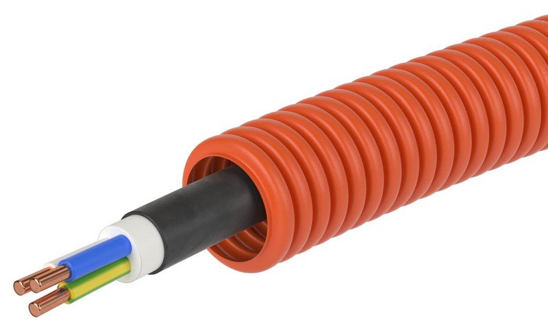 Труба гофрированная с кабелем. Труба гофрированная (ПНД) + кабель ВВГнг(А)-LS 3х2,5 мм² РЭК (ГОСТ+); Ø-номин. 20 мм, IP55, t-раб.-40…+90°С, цвет оранжевый. Бухта 100 м.
