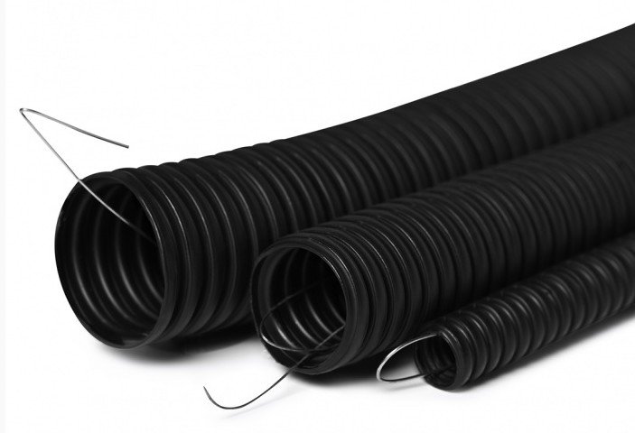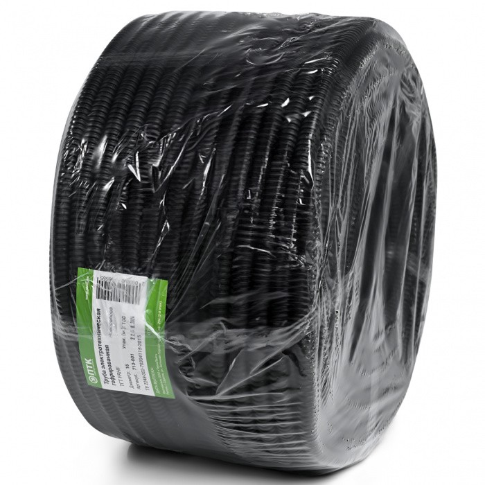 Труба гофрированная. Труба гофрированная с протяжкой, композиция ПНД с антипиреном, трудногорючая безгалогенная (HF), D-наружный 25 мм, D-внутр. 18.3 мм, IP55, t-монтажа -25...+60°C, t-раб. -40...+90°C, цвет чёрный, бухта 75 м