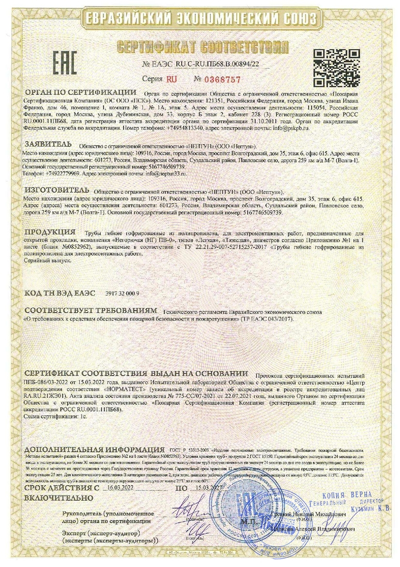 - надежность и безопасность:- высокая коррозионная и химическая стойкость;- высокая ударная прочность;- повышенная термостойкость по сравнению с гофрированными трубами из ПВХ и ПНД;- высокая гибкость по сравнению с трубами из ПВХ и ПНД;- труба в исполнении «Безгалогенная (HF)» не содержит вредных для здоровья веществ;- в исполнении «Безгалогенная (HF), стойкая к ультрафиолету (УФ)» устойчива к фотоокислительному старению (эксплуатация на открытом воздухе при воздействии прямых солнечных лучей);- в исполнении «Не распространяющая горение» труба соответствует требованиям пожарной безопасности ГОСТ Р МЭК 61386.1 (п. 13.1.3.1, п. 13.1.3.2);- труба «Тяжелого» типа способна выдерживать большие механические нагрузки (допускается заливка бетоном);- труба устойчива к воздействию влаги, которой она может подвергаться в режиме нормальной эксплуатации;- труба устойчива к старению;- труба обладает соответствующей теплостойкостью.