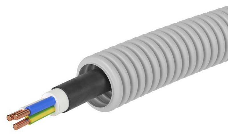 Труба гофрированная с кабелем. Труба гофрированная (ПВХ) + кабель ВВГнг(А)-LS 3х2,5 мм² РЭК (ГОСТ+); Ø-номин. 20 мм, IP55, t-раб.-25…+60°С, цвет серый. Бухта 50 м.
