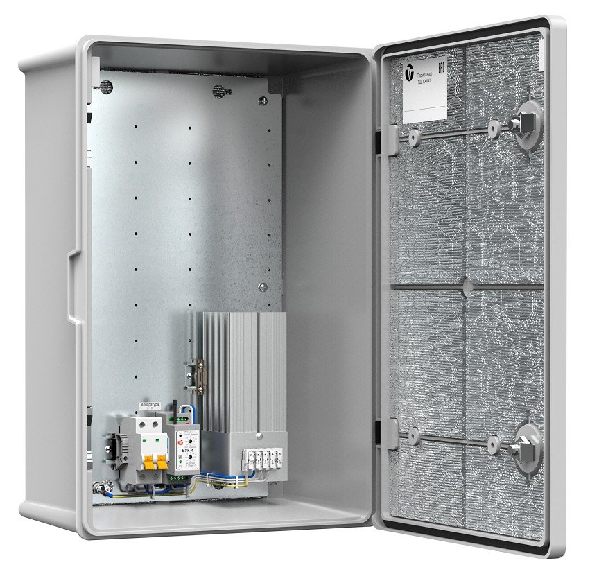 Шкаф монтажный с обогревом. Термошкаф из армированного стекловолокном полиэстера с обогревом; блок управления климатом БУК-4, обогреватель ОТШ со встроенным вентилятором, тампер; U-пит.220 В, I-нагр.6 А, P-нагрев.240 В; IP66, t-раб.60…+80°C, 402х585х260 мм, 15 кг.
