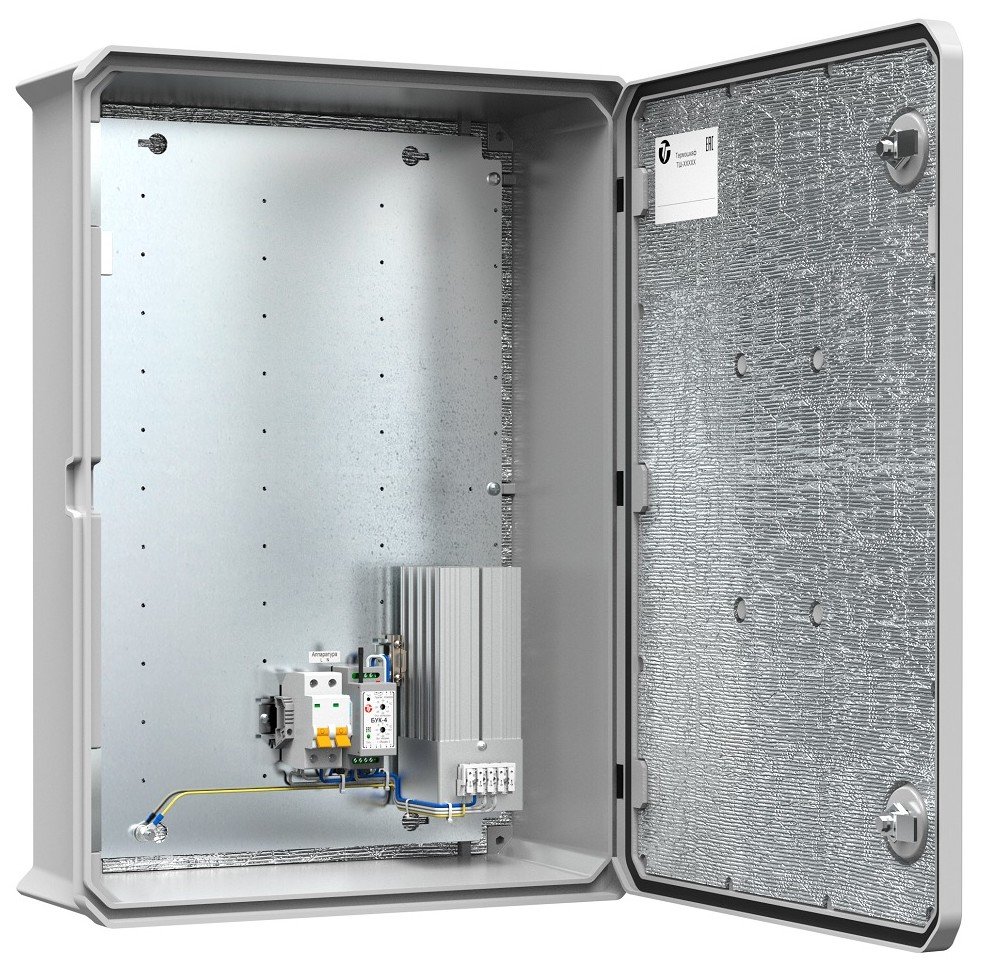 Шкаф монтажный с обогревом. Термошкаф из армированного стекловолокном полиэстера с обогревом; блок управления климатом БУК-4, обогреватель ОТШ со встроенным вентилятором, тампер; U-пит.220 В, I-нагр.6 А, P-нагрев.350 В; IP66, t-раб.60…+80°C, 505х705х204 мм, 18 кг.