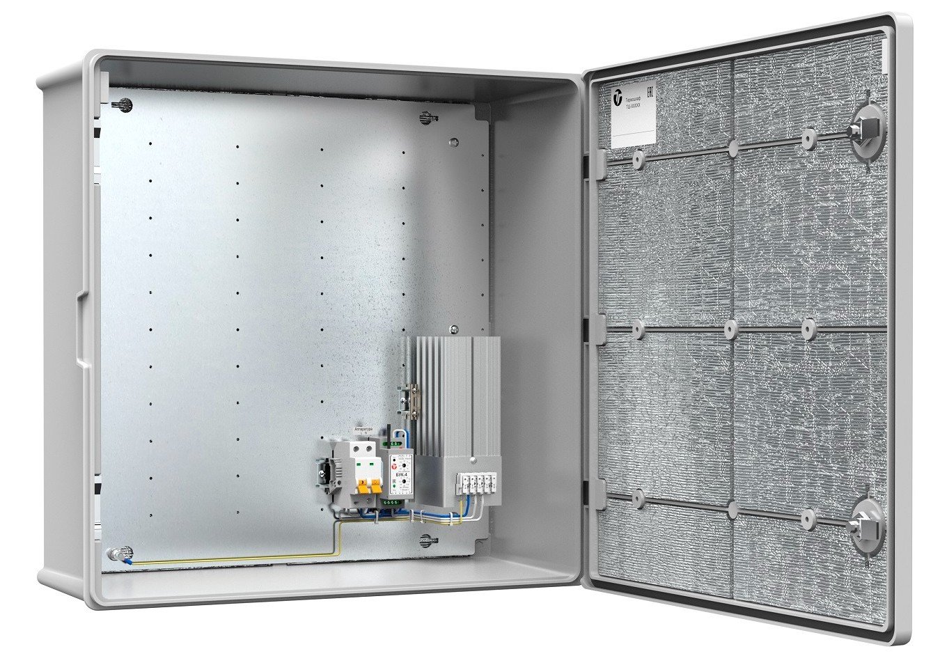 Шкаф монтажный с обогревом. Термошкаф из армированного стекловолокном полиэстера с обогревом; блок управления климатом БУК-4, обогреватель ОТШ со встроенным вентилятором, тампер; U-пит.220 В, I-нагр.6 А, P-нагрев.350 В; IP66, t-раб.60…+80°C, 642х625х260 мм, 20 кг.