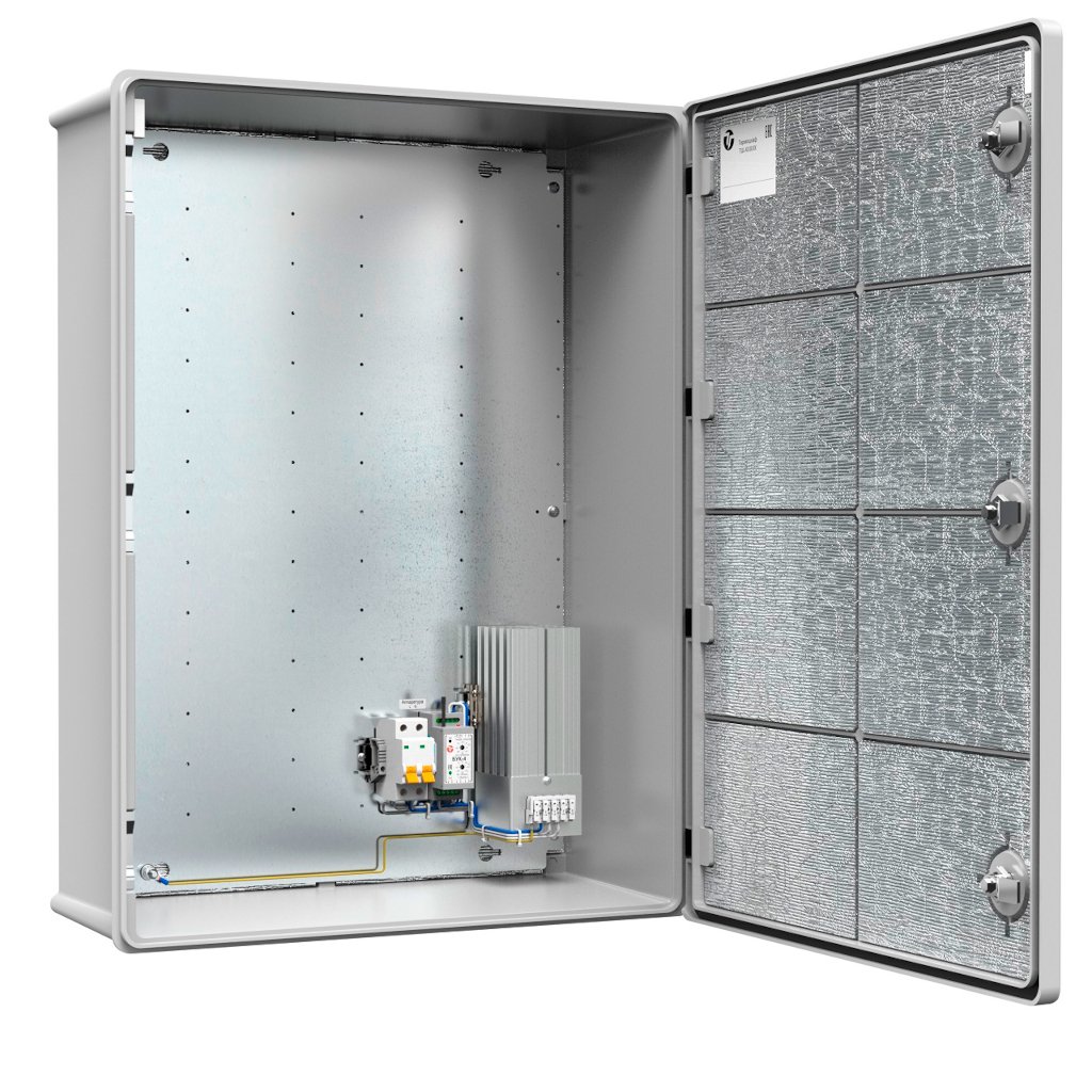 Шкаф монтажный с обогревом. Термошкаф из армированного стекловолокном полиэстера с обогревом; блок управления климатом БУК-4, обогреватель ОТШ со встроенным вентилятором, тампер; U-пит.220 В, I-нагр.6 А, P-нагрев.350 В; IP66, t-раб.60…+80°C, 602х802х268 мм, 25 кг.