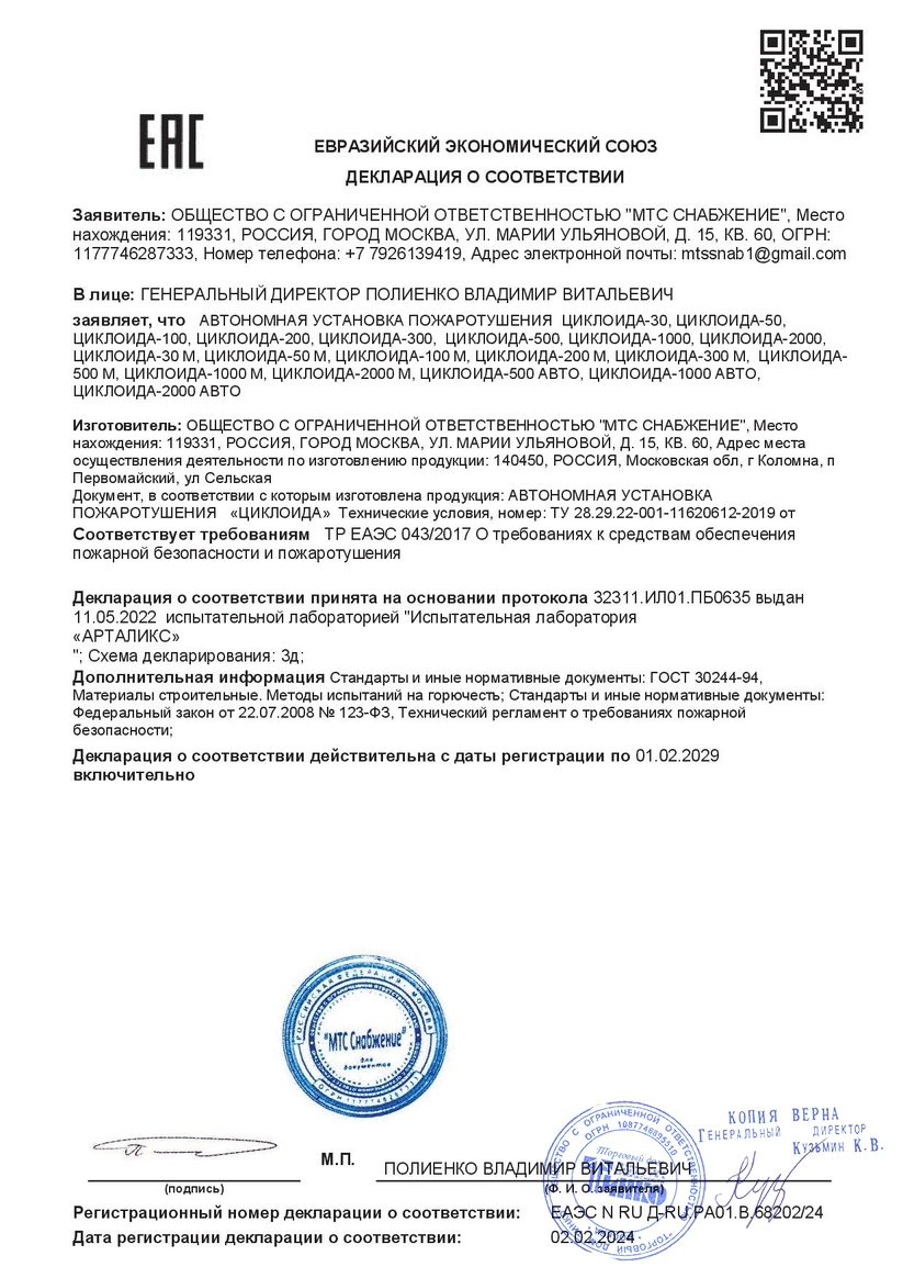 Автономная установка пожаротушения. Автоматическая установка пожаротушения для защиты электрощитов, вводно-распределительных устройств, корпусного электрооборудования; защищаемый объем 1500 л, t-сраб. +120...+150°С, время тушения до 1 мин.; t-раб.-40...+60°С, длина 2500 мм