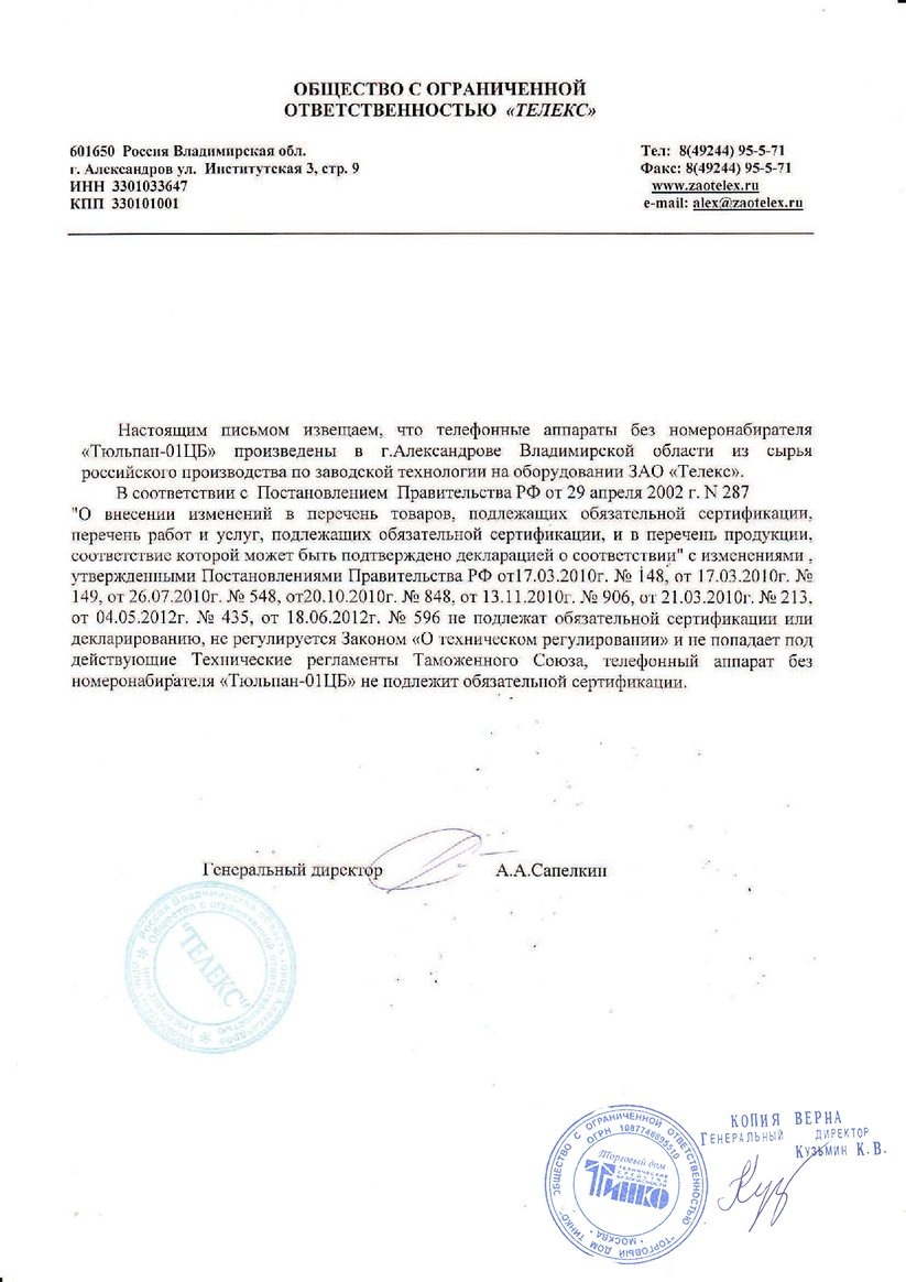 Телефон без номеронабирателя. Телефонный аппарат Тюльпан-01ЦБ предназначен для использования в качестве безнаборного аппарата с миниАТС и иными системами оперативной связи, например: Регион-120, Каскад, JNS, Максиком и др. Аппарат допускает подключение к установке АВУ (с раздельными цепями разговора и вызова); подключение - 2-х и 3-х проводное; 48-60В; регулировка громкости вызова - механическая; -10... +35˚С