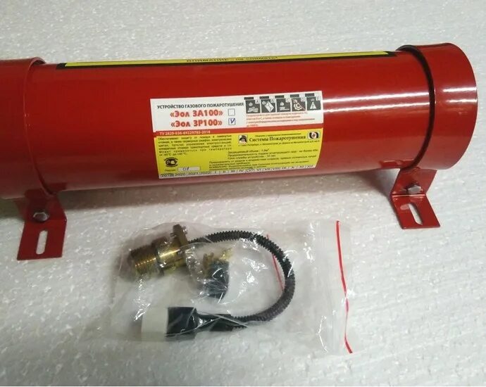 Устройство газового пожаротушения. Устройство пожаротушения с принудительным запуском с радиальным истечением ОТВ для тушения пожаров классов А2, В, С, Е (до 1000 В); состав ОТВ: CO₂ - 63.3%; H₂O - 25.63%; N₂ -10.29%; CH₄ - 0.66%; H₂ - 0.094%; CO - 0.001%; NH₃ -0.0006%; защищаемый объем ≤1,0 м³, инерционность срабатывания ≤10 с, время подачи ОТВ ≤45 с; параметры эл.запуска: U-пуск. ≤36 В, I-пуск. ≥0.7 А, I-контр. ≤0.15 А, R-пуск.цепи ≤2.5 Ом; климатическое исполнение У2.1, t-раб. -50…+50°C, габ.размеры D89х333 мм