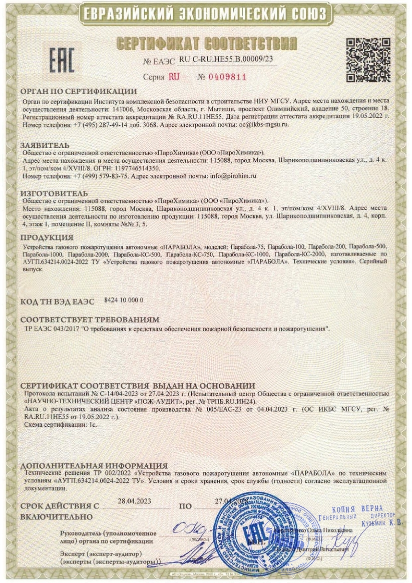 Автономная установка пожаротушения. Автономная установка газового пожаротушения пожаров класса A, B, E; защищаемый объём 2000 л; t-сраб.130°С; диаметр изделия 16±1 мм; масса ОТВ 1000±50 г; t-раб.-40…+60°С. Масса 1400±150 г. Срок службы 10 лет. Сертифицированы по ТР ЕЭАС 043/2017