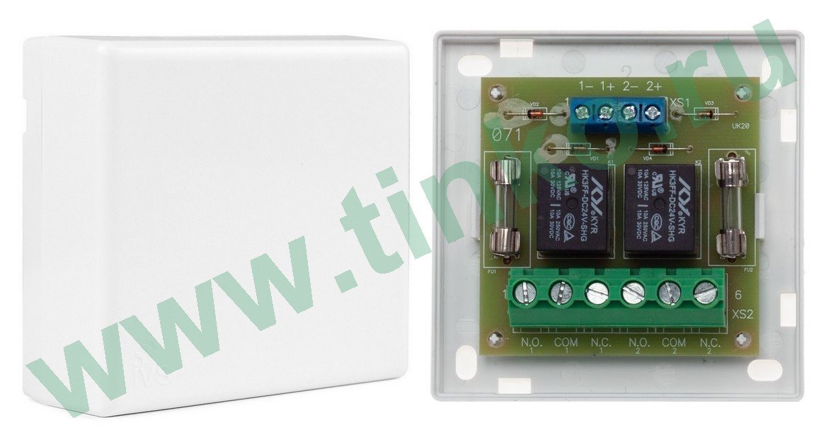 Устройство коммутационное. Устройство коммутационное; 2 реле с контактами на переключение; U-пит.24 В, I-потр.17...28 мА; U-коммут.250, I-коммут.10 А; t-раб.-10...+50°С, 100.6х80.7х43.5 мм
