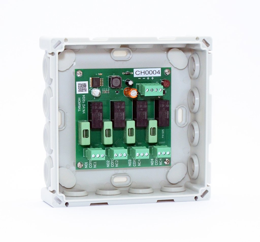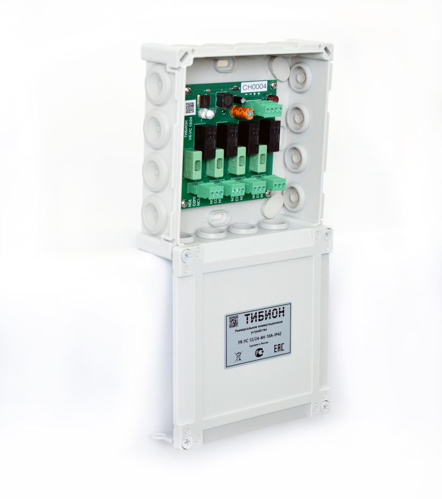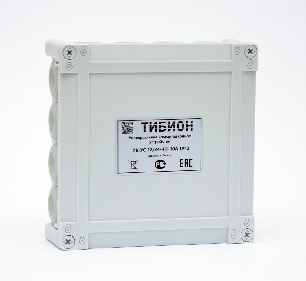 Универсальное коммутационное устройство. Устройство коммутационное; 4 реле, контакты на переключение, U-коммут.до 240В, I-коммут.до 10 А; один вход управления, U-упр.12…24; IP42, t-раб.-10…+45°C, 180х180х62 мм, 0.58 кг
