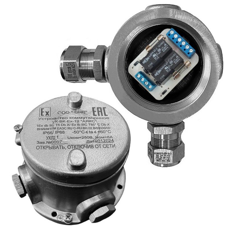 Устройство коммутационное взрывозащищенное. Взрывозащищенное устройство управления и коммутации, 1EX DB IIC T6 DB Х/EX TB IIIC T85°C DB Х, два реле, контакты на переключение. U-упр.12 В, I-упр.55 мА, U-коммут.до 250В, I-коммут.до 8 А; IP66/IP68, t-раб.-50...+60°C, D117х85 мм, 1,3 кг. Угловое исполнение УК-ВК-Ех-12 под два кабельных ввода Ех-МКВМ М20 (ххх) из нержавеющей стали (резьба М20х1.5, тип штуцера (ххх)- К, КМ, В или Т - уточняется при заказе)