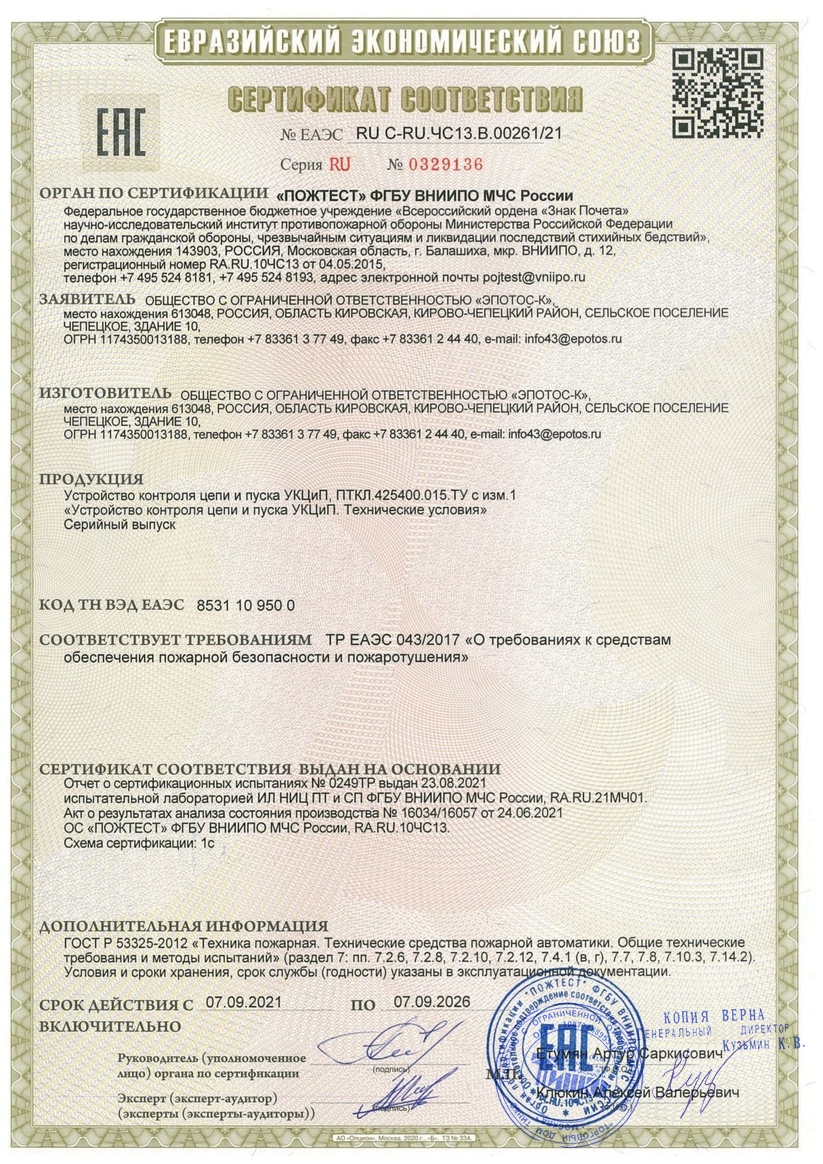 Предназначено для контроля цепи пуска исполнительных устройств (модулей пожаротушения) на "ОБРЫВ", световой индикации состояния цепи, передачи сигнала на ППУ и запуск исполнительных устройств по сигналу от ППУ.