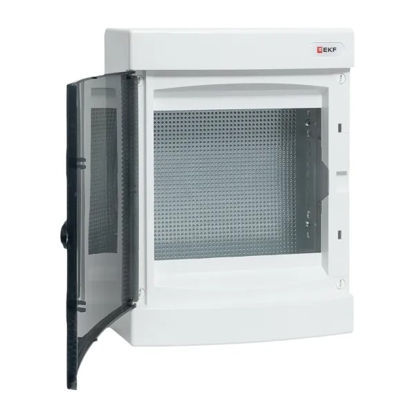 Щит слаботочный навесной Unix. Щит слаботочный навесной пластиковый, прозрачная матовая дверца; 1 монтажная перфорированная панель, IP41, t-раб.-25…+60°C, габ.размеры 361х287х112 мм. Цвет белый.