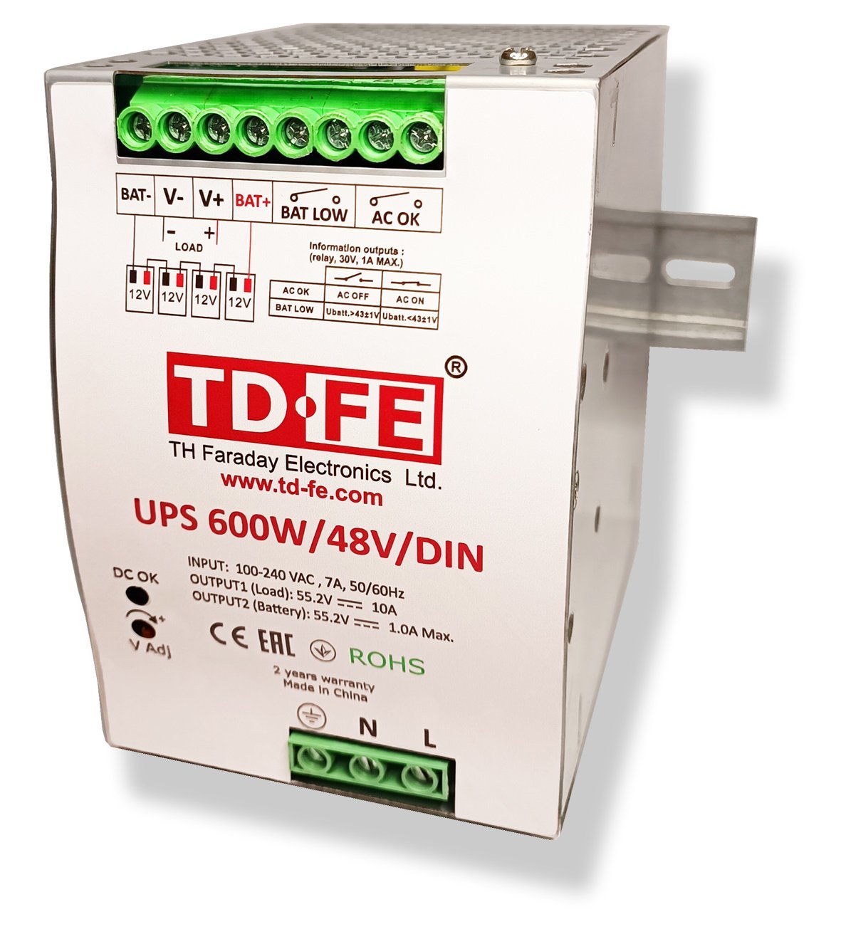 Источник вторичного электропитания резервированный. Резервированный источник питания с креплением на DIN рейку; U-вх.90…264 В (переключаемое), U-вых.46…55.3 В (регулируемое), I-нагр.11 А; под четыре АКБ 12 В 9…26 А·ч; защита от КЗ, перегрузки, перенапряжения и защита от глубокого разряда АКБ; светодиодный индикатор, релейные выходы наличия входного напряжения и состояния АКБ; t-раб.-20…+60°C, 128х125х85 мм.