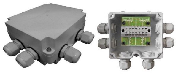 Коробка коммутационная. Устройство соединительное, пластиковый корпус, 4 пластиковых гермовводов под кабель Ø 13...18 мм, клеммник РМ2 (400В/24А, 2.5 мм²), t-раб. -55…+60 °С, IP66, габ.размеры 200х157х67 мм