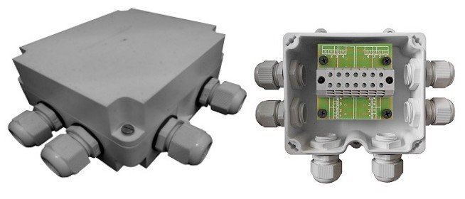 Устройство соединительное УСБ «СЕВЕР» предназначено для соединения (разветвления) электрических проводок в цепях с медными и алюминиевыми жилами, сигнальных кабелей, например в шлейфах пожарной или охранно-пожарной сигнализации, линиях связи и телекоммуникаций, цепях в системах управления и автоматики, а также подключения в шлейфы оконечных устройств, например датчиков сигнализации, абонентских устройств систем связи и т.п. Конструктивно УСБ «СЕВЕР» выполнено в корпусе из пластика, устойчивого к естественному ультрафиолетовому излучению. Корпус изделия может быть оборудован герметичными пластиковыми кабельными вводами для подведения проводников диаметром от 6 до 12 мм* (*- по согласованию с заказчиком изделие может поставляться с пластиковыми кабельными вводами с диаметром подключаемого кабеля от 13 до 18 мм) или металлическими кабельными вводами серии МКВ из нержавеющей стали марки 12Х18Н10Т. Внутри корпуса изделия установлена печатная плата, на которой расположены винтовые клеммники Т31, DG3 или РМ2 для подключения соединяемых проводников сечением: Т31 - 2.5 мм2, DG3 - 1.5мм2 или РМ2 - 2.5 мм2.