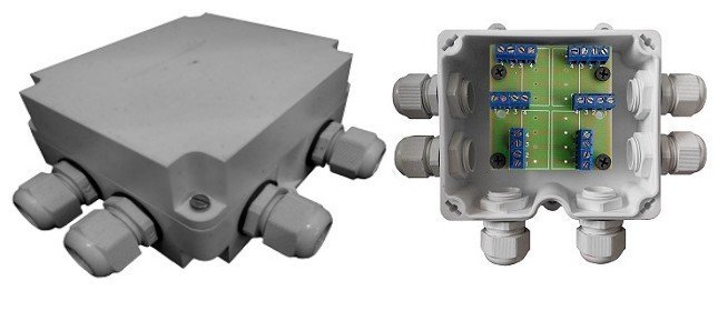 Устройство соединительное УСБ «СЕВЕР» предназначено для соединения (разветвления) электрических проводок в цепях с медными и алюминиевыми жилами, сигнальных кабелей, например в шлейфах пожарной или охранно-пожарной сигнализации, линиях связи и телекоммуникаций, цепях в системах управления и автоматики, а также подключения в шлейфы оконечных устройств, например датчиков сигнализации, абонентских устройств систем связи и т.п. Конструктивно УСБ «СЕВЕР» выполнено в корпусе из пластика, устойчивого к естественному ультрафиолетовому излучению. Корпус изделия может быть оборудован герметичными пластиковыми кабельными вводами для подведения проводников диаметром от 6 до 12 мм* (*- по согласованию с заказчиком изделие может поставляться с пластиковыми кабельными вводами с диаметром подключаемого кабеля от 13 до 18 мм) или металлическими кабельными вводами серии МКВ из нержавеющей стали марки 12Х18Н10Т. Внутри корпуса изделия установлена печатная плата, на которой расположены винтовые клеммники Т31, DG3 или РМ2 для подключения соединяемых проводников сечением: Т31 - 2.5 мм2, DG3 - 1.5мм2 или РМ2 - 2.5 мм2.