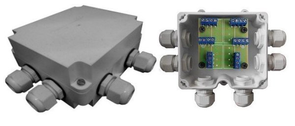 Коробка коммутационная. Устройство соединительное, пластиковый корпус, 4 пластиковых гермовводов под кабель Ø 6...12 мм, винтовой клеммник DG3 (300В/16А, 1.5 мм²), t-раб. -55…+60 °С, IP66, габ.размеры 200х157х67 мм