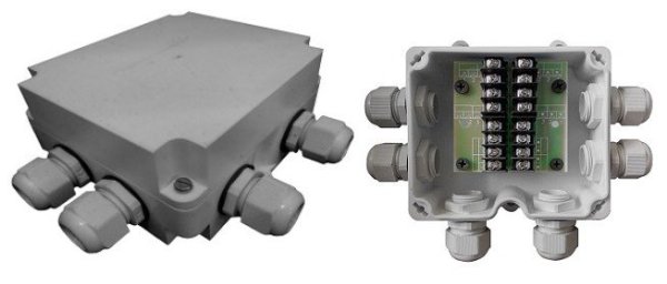Коробка коммутационная. Устройство соединительное, пластиковый корпус, 6 пластиковых гермовводов под кабель Ø 13...18 мм, барьерный клеммник Т31 (300В/10А, 2.5 мм²), t-раб. -55…+60 °С, IP66, габ.размеры 200х157х67 мм