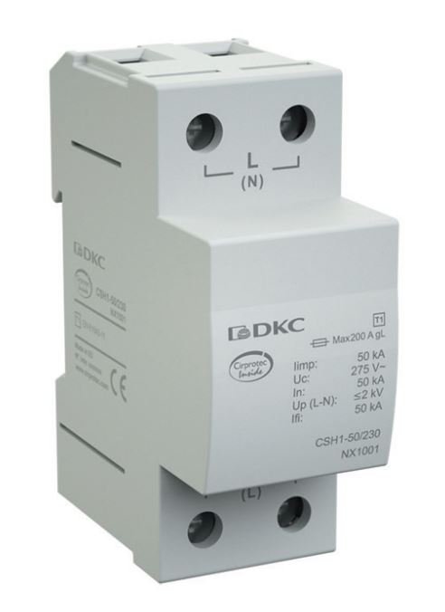 Устройство защиты от импульсных перенапряжений. УЗИП, класс I, 2-полюсный, N-PE, 100кА, на основе газонаполненных разрядников для применения в зданиях, обладающих внешней системой молниезащиты или снабжающихся электроэнергией по воздушным линиям. УЗИП устанавливаются на вводе питающей сети в здание (ВРУ/ГРЩ). Монтаж на DIN-рейку.