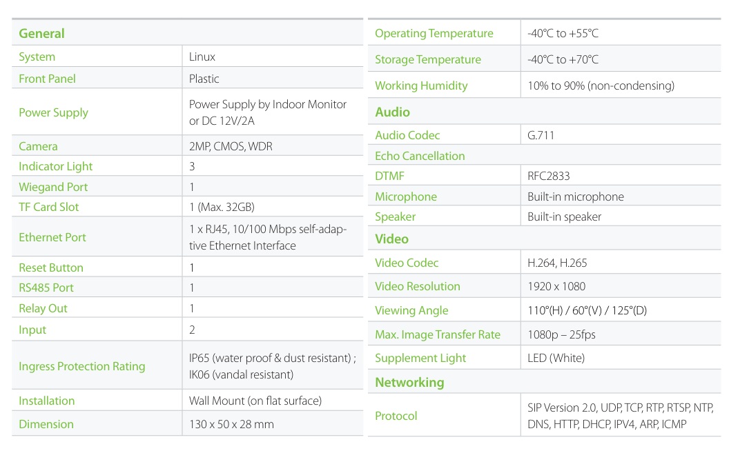 - Компактная конструкция панели;- CMOS-камера 2 Мп с поддержкой WDR;- Видеокодеки H.264 и H.265;- Класс защиты IP65 для защиты от воды и пыли;- Сигнализация о несанкционированном доступе и взломе;- Класс защиты IK06 для защиты от вандалов;- Питание от внутреннего монитора.