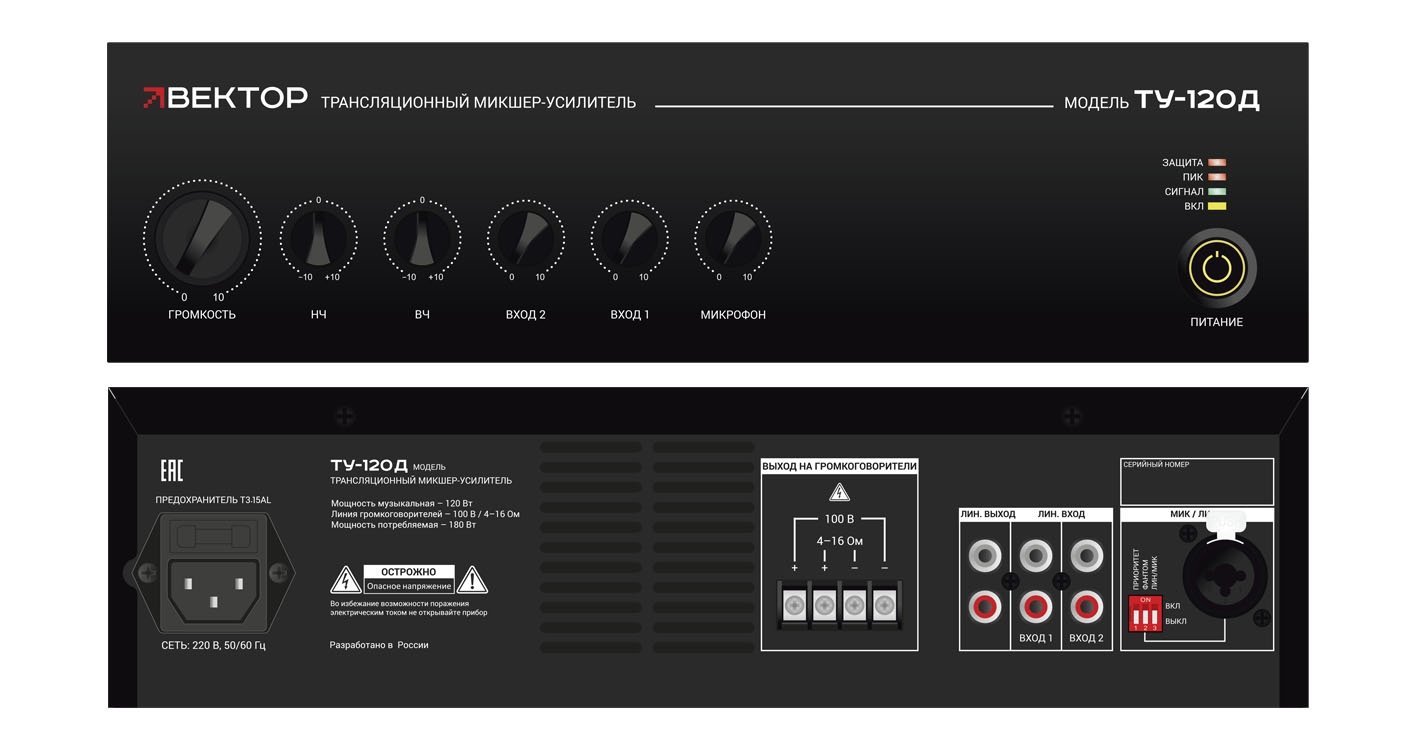 Микшер-усилитель комбинированный. ВЕКТОР ТУ-120Д Микшер-усилитель класс D. 120 Вт. Потребляемая мощность 180 Вт. Выход 100В/4-16Ом, 1 микр и 2 AUX входа, 1 AUX выход. 220В, 330х88х225 мм, 4,8 кг. Рэковое крепление в комплекте.