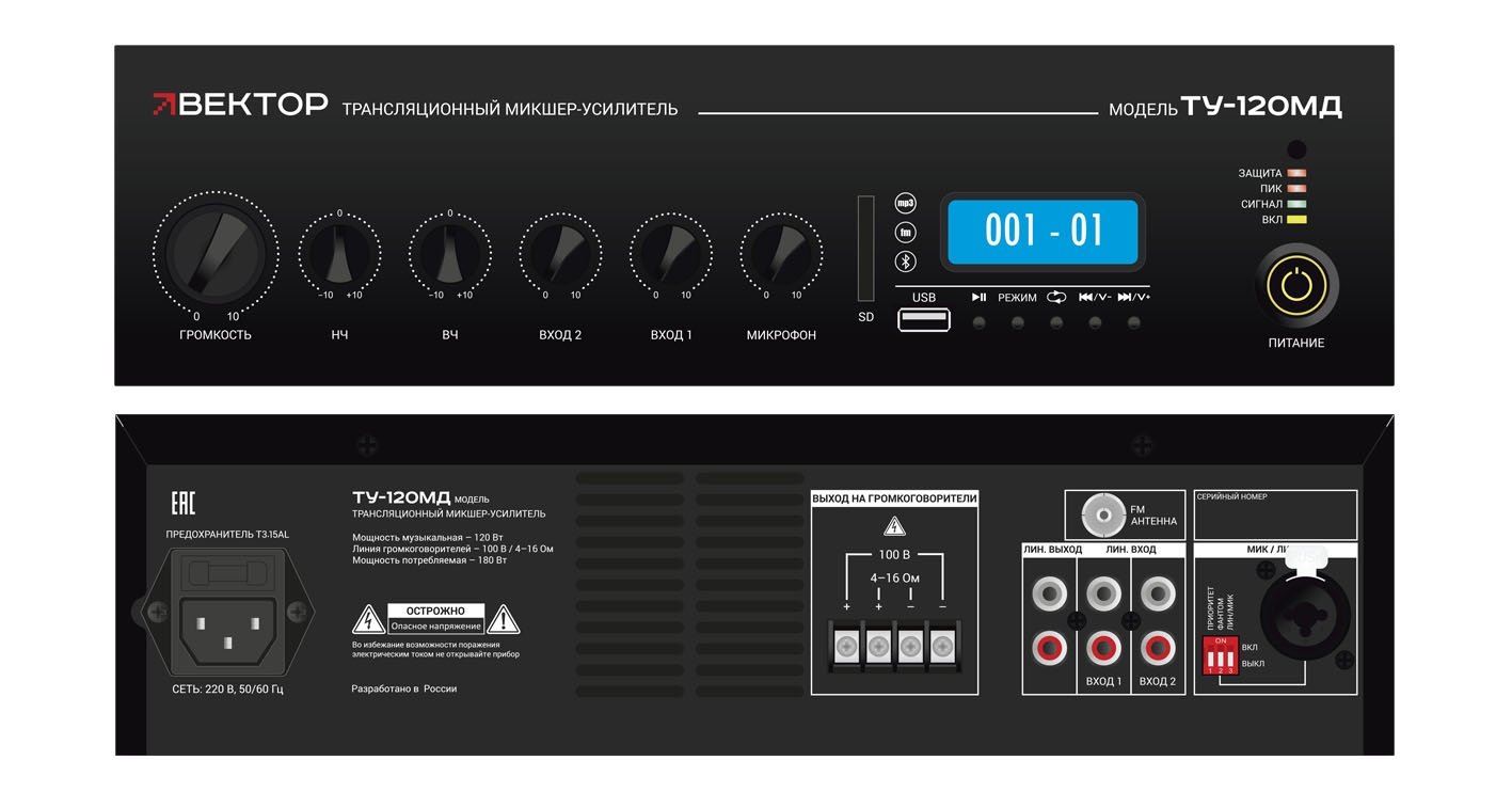 Микшер-усилитель комбинированный. ВЕКТОР ТУ-120МД Комбинированный микшер-усилитель класс D. Мощность 120 Вт. Потребляемая мощность 180 Вт. Выход 100 В/4-16Ом, 1 микр и 2 AUX входа, 1 AUX выход. Цифровой FM тюнер, MP3 плеер, USB, SD, Bluetooth. 220В, 330х88х250 мм, 5,5 кг. Рэковое крепление в комплекте.